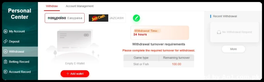 Go to the Withdrawal section, select EasyPaisa, JazzCash, or your bank account, enter the amount, and submit the request.